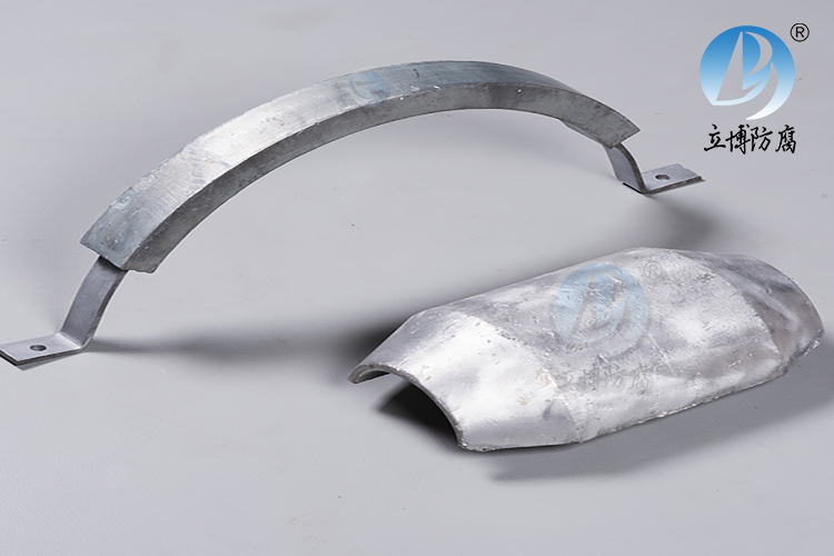 對于管道,使用手鐲形陽極。它們由成組比較寬大并部分彎曲的板狀陽極組成,固定在像手鐲那樣互相彎在一起的鐵帶支架上,并吸附安置在管道上。為了相同的目的,可將一對半筒形陽極用力扣緊在管道上再焊接固定。
