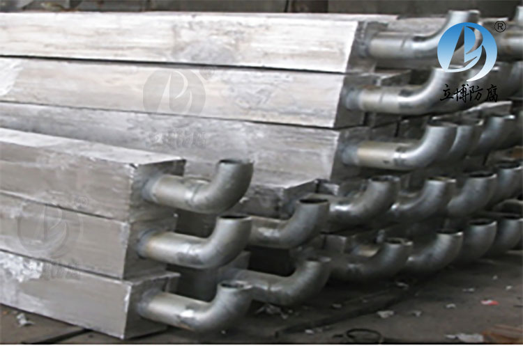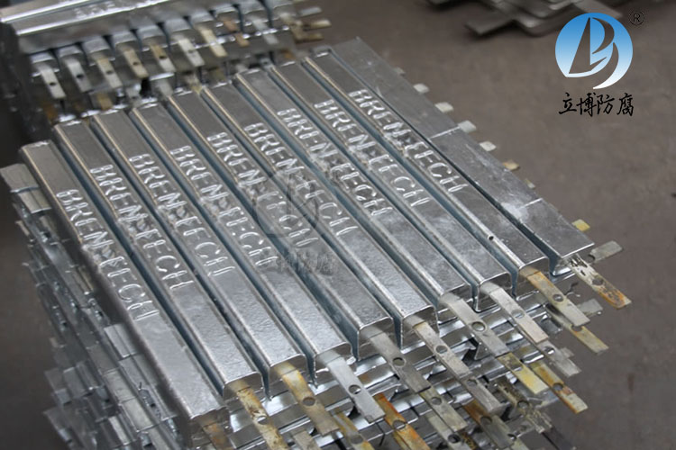 帶有澆鑄支撐件的板塊狀實體陽極,主要用于艦船外防腐、鋼-水結(jié)構(gòu)防腐、大型儲罐內(nèi)防腐。這種形狀的陽極不適合在土壤中使用,因為接地電阻過大。實體陽極方形、短形或圓形截而,并且常有鐵管澆鑄在里面,以便用螺栓固定、這類陽極通??勺龀涉V陽極。儲罐內(nèi)防腐使用實體陽極。板狀陽極主要用在流動阻力盡可能低的地方,如用于艦船的外防腐。這樣的陽極或長:短,有淚滴狀(流線型),兩端用突出的扁鋼支撐或焊接有側(cè)向鉤環(huán)。只要單個陽極有組成一體,它們的邊就加工成斜坡狀。此外,有些板塊狀陽極可以用螺栓固定。